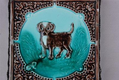 Title (ebay affiliate link): 19th Century Architectural Majolica Dog Tile Hot Plate Mounted Wire Frame