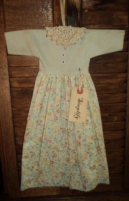 GRUNGY PRIMITIVE WALL~CUPBOARD DOLL DRESS BLUE CHECK FLORAL~FOLK ART~DECOR