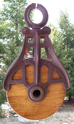 Title (ebay affiliate link): Antique Primitive Cast Iron and Wood Barn Pulley Farm Tool Hay Loft Rustic