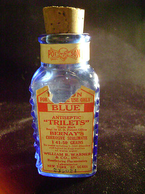 Title (ebay affiliate link): Cobalt blue apothecary triangular jar w/ orig. label POISON, skull & crossbones