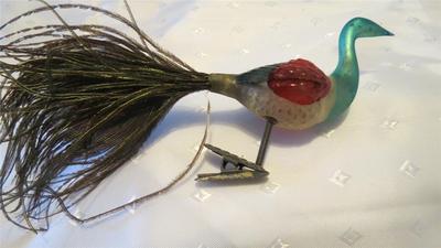 Title (ebay affiliate link): MERCURY GLASS HAND BLOWN PEACOCK CLIP ORNAMENT W/ REAL FEATHER TAIL #13