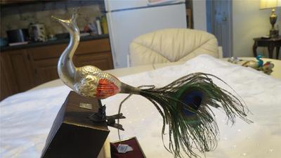 Title (ebay affiliate link): MERCURY GLASS HAND BLOWN PEACOCK CLIP ORNAMENT W/ REAL FEATHER TAIL GERM #11