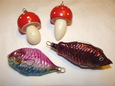 4 Antique Christmas Glass Figural Bulbs- Mercury, Germany - Mushrooms & Fish