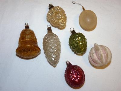 7 Antique Christmas Mercury Glass Bulbs - Bell, Grapes, Berry, Pinecone +