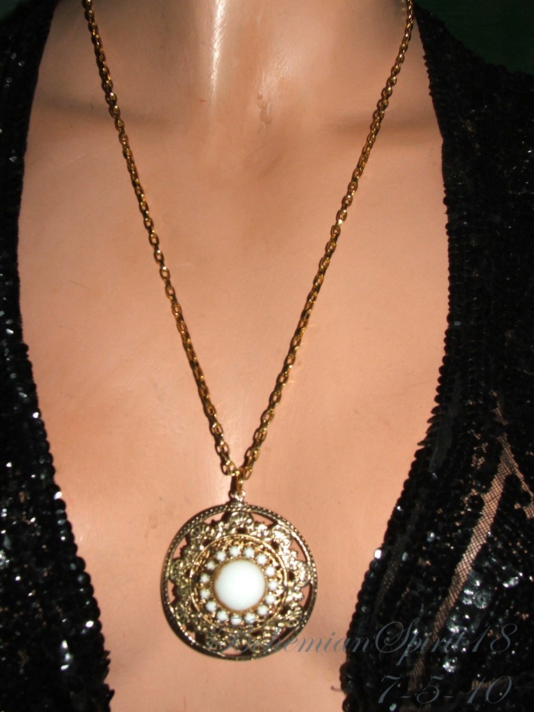 VINTAGE FILIGREE GOLDTONE & MILK GLASS PENDANT/NECKLACE