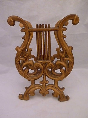 Title (ebay affiliate link): Vintage Cast Metal Gold Colored Lyre Harp Sheet Music Stand/Magazine Rack
