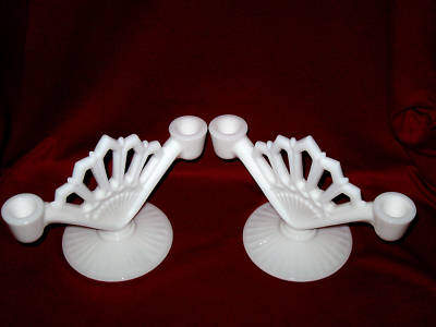 PAIR FOSTORIA MILK GLASS "ARLINGTON" DUO CANDLE HOLDERS