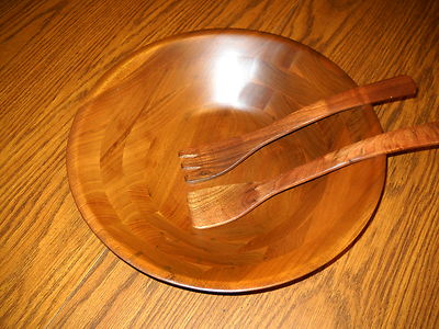 Title (ebay affiliate link): VINTAGE VERMILLION WALNUT 14" SALAD BOWL WITH TOSSING FORK & PADDLE