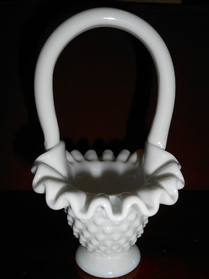 Title (ebay affiliate link): FENTON white milk glass hobnail candy basket with handle art flower crimped mint