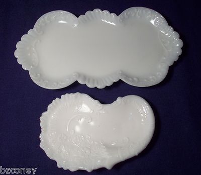 2 VICTORIAN Style White Milk Glass Vanity Desser Perfume Tray Dish Scallop Trim