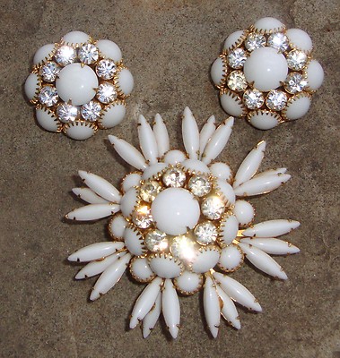 Title (ebay affiliate link): Vintage Brooch Earrings Milk Glass Rhinestones Layered Cabochons Navettes