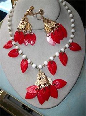 Title (ebay affiliate link): VTG 50'S++MOLDED HARD PLASTIC RED LEAF DANGLE++MILK GLASS BEADS++RETRO SET
