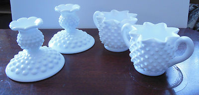 Milk Glass Hobnail Candlesticks and Cream & Suger Bowl