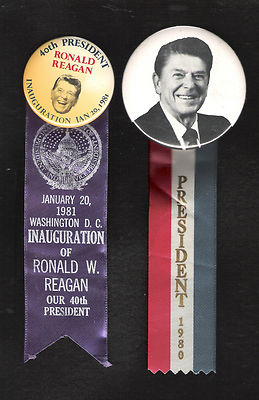 Title (ebay affiliate link): 2 unusual RONALD REAGAN buttons with ribbons from 1980 campaign, inauguration