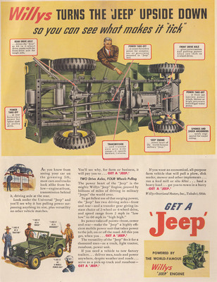 1946 Willys Jeep Engine: Turns the Jeep Upside Down, Print Ad