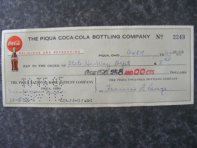 Title (ebay affiliate link): COCA COLA CHECK, THE PIQUA COCA COLA BOTTLING COMPANY 1962