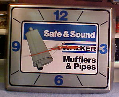 VINTAGE Metal Aluminum Auto Car WALKER MUFFLERS & PIPES Clock RUNS
