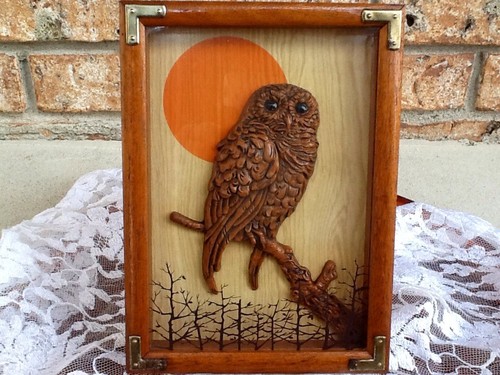 Title (ebay affiliate link): Vintage 3-D Wood Carved OWL FIGURINE Reverse Painted Shadowbox DECO Wall Art