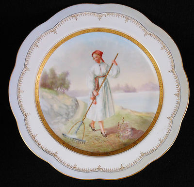 Super 19th C. Gustavsberg 8 1/2" Hand Painted Plate, Peasant Girl & Rake