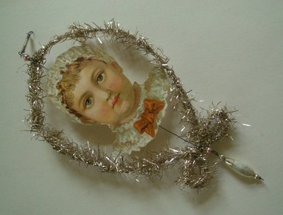 Title (ebay affiliate link): ANTIQUE TINSEL FRAME WITH PAPER GIRL HEAD DIE CUT CHRISTMAS ORNAMENT