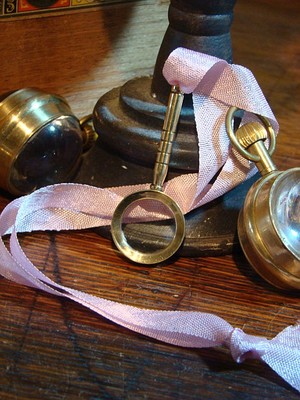 Title (ebay affiliate link): VINTAGE MINIATURE MAGNIFYING GLASS BRASS PENDANT-On Antique Ribbon Steam Punk