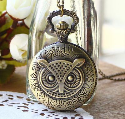 Title (ebay affiliate link): Steampunk Antique Necklace Chain Night Owl Quartz Clock Pocket Watch