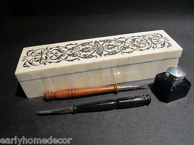 Title (ebay affiliate link): Antique Style Blue Inkwell Scrimshaw Box Turned Wood and Bone Pen Desk Set