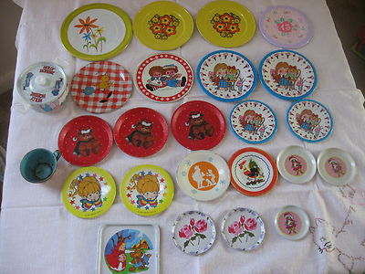 Title (ebay affiliate link): CHILDS VINTAGE TIN TOY DISHES LOT~OHIO ART-HOLLY HOBBIE-HALLMARK-RED RIDING HOOD