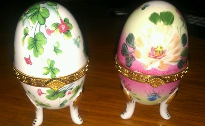 Title (ebay affiliate link): Decorative eggs (2) Hinged,Roses and Clover trinket boxes~