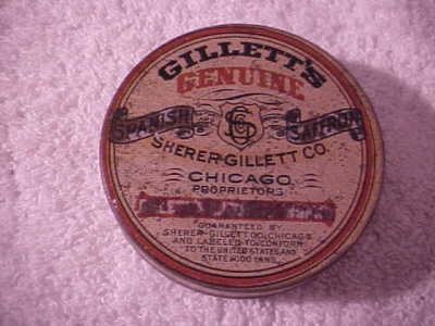 GILLETT'S SAFFRON EARLY SPICE TIN CHICAGO OWL BIRD PIC CHIC SHABBY PRIMITIVE OLD