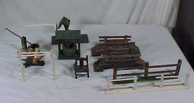 ANTIQUE CHRISTMAS TREE PUTZ SET FENCE BRIDGE WELL ARCH CHAIR WHEELBARROW ETC
