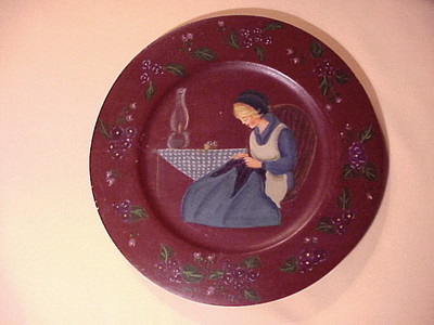 2 AMISH CAPS & GIRL SEWING A QUILT~TOLE PAINT WOOD PLATE~12"