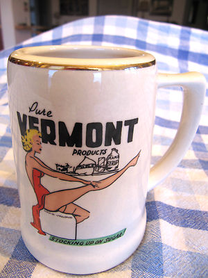 Title (ebay affiliate link): VTG RISQUE VERMONT PIN UP ART ADVERTISE STEIN MUG MAPLE SYRUP SAP BUCKET CORSET!