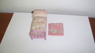 TOOTSIE TOY ANTIQUE DOLL HOUSE FURNITURE PINK BED W/ MATTRESS,PILLOW & RUG