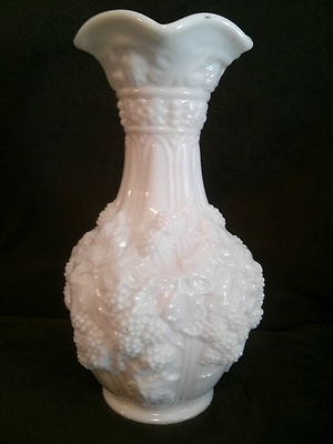 Title (ebay affiliate link): 1950s IMPERIAL GLASS CO. MILK GLASS VASE WITH ORNATE GRAPES AND VINES, 10" TALL