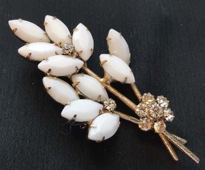 Title (ebay affiliate link): LOVELY VINTAGE WHITE MILK GLASS & RHINESTONE GOLD TONE PIN
