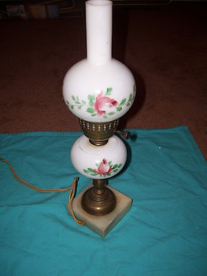Title (ebay affiliate link): White Milk Glass Hand Painted Flowers Hurricane Style Marble Base Electric Lamp