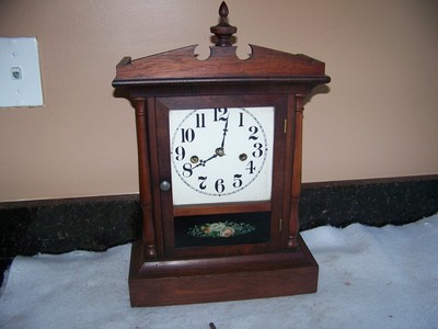Title (ebay affiliate link): Antique Waterbury Mantle Clock Old Reverse Glass Painted Roses Ruby 1874