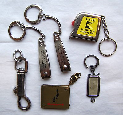Title (ebay affiliate link): 6 VTG metal Key Chains nail clipper tape measure magnifying glass ring fob lot