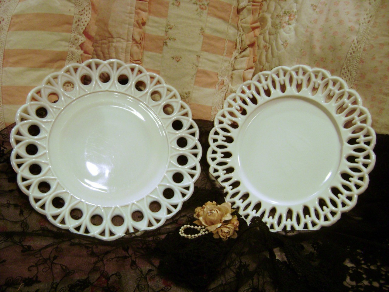 LOVELY MILK GLASS 2 PLATES WITH CUT OUT RIM