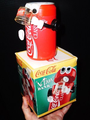 Title (ebay affiliate link): Vintage Coca Cola 20 yr. OLD Soda Pop COKE CAN ROBOT COIN MONEY BANK MIB