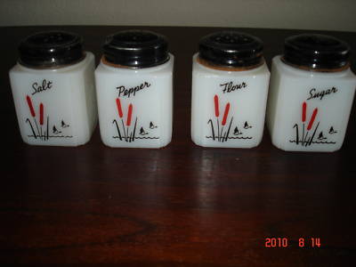 TIPP CITY MILK GLASS CATTAILS S,P,F,SU,SHAKERS