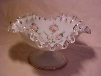 VINTAGE FENTON MILK GLASS COMPOTE W/ PAINTED ROSES DEC