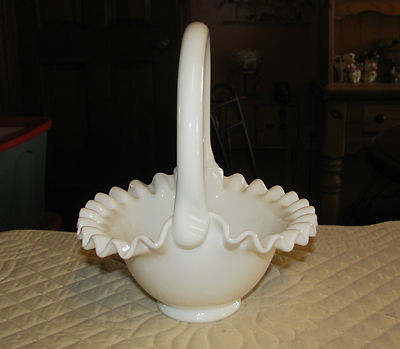 Title (ebay affiliate link): VINTAGE FENTON WHITE MILK GLASS HANDLED BASKET WITH CRIMPED & RUFFLED RIM MARKED