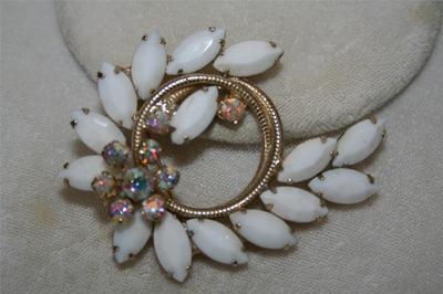 Title (ebay affiliate link): BEAUTIFUL VINTAGE JULIANA OPEN BACK AB & MILK GLASS RHINESTONE FLOWER BROOCH