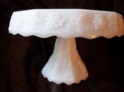 WHITE MILK GLASS FOOTED CAKE PLATE GRAPE MOTIF