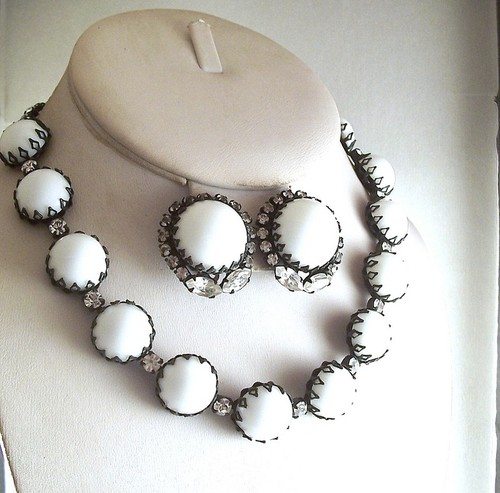 Title (ebay affiliate link): Vintage Milk Glass Clear Rhinestone Necklace Earrings SET Demi Parure