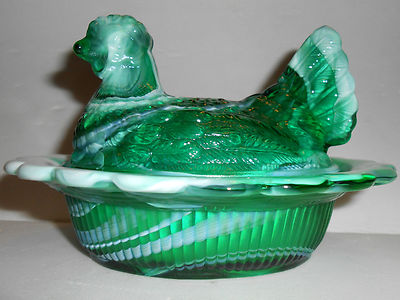 Title (ebay affiliate link): Green and white milk slag glass salt cellar hen chicken on nest basket dish mint