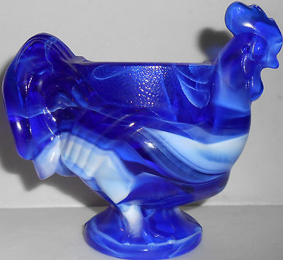 Cobalt blue milk slag glass hen / chicken egg cup toothpick holder dish rooster