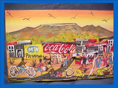AFRO AMERICAN,AFRICAN VILLAGE SCENE,COKE CAN,COCA COLA WALL POP folk ART,WOOD,